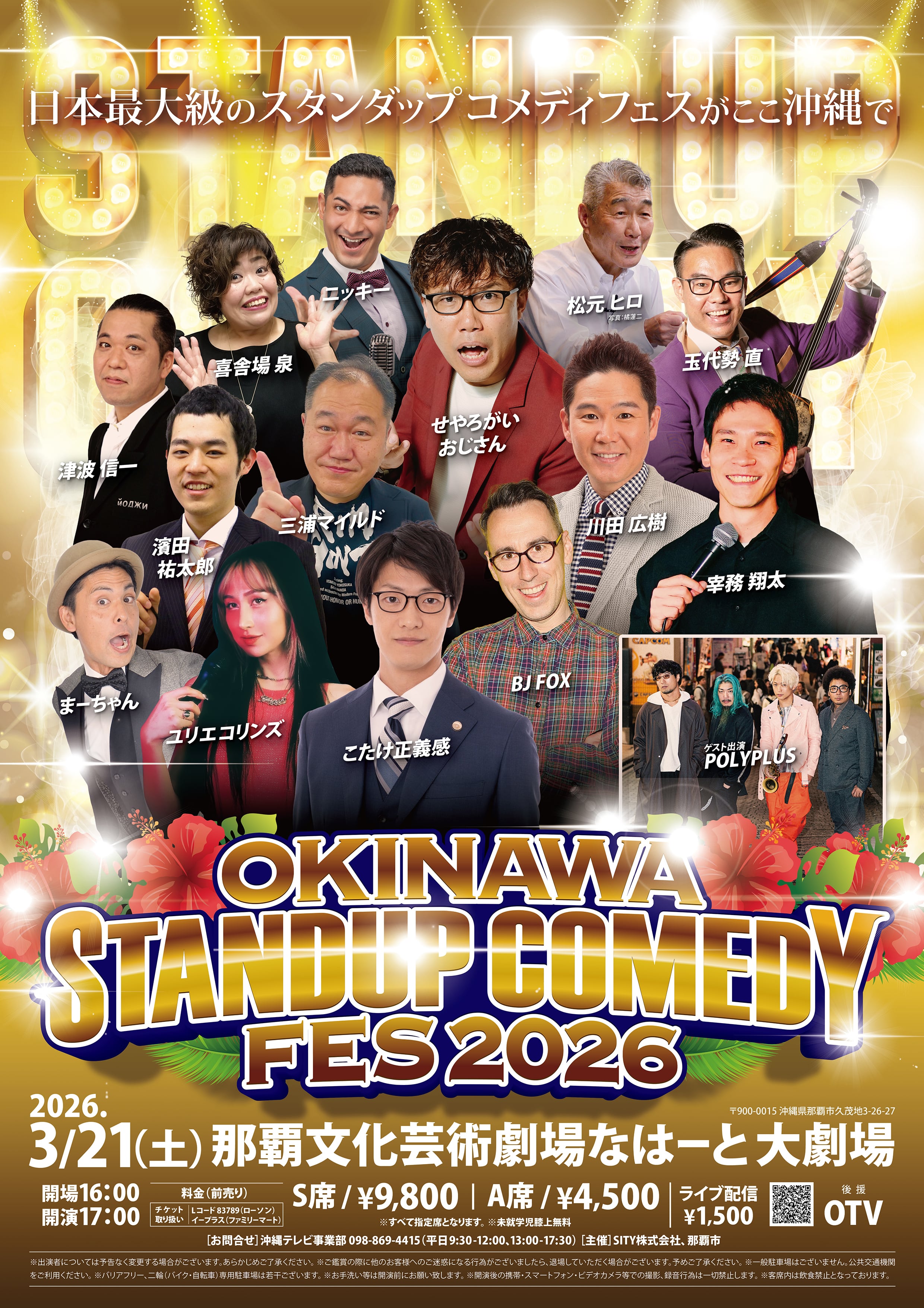 3月21日、なはーと大劇場で開催される「OKINAWAスタンダップコメディフェス」をオンラインで視聴できるチケット。